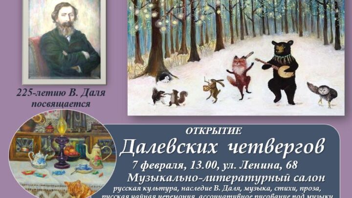 К 225-летию великого учёного мы с радостью открываем новый цикл арт-встреч ,Далевские четверги», от которых ждём интересных встреч и общения, слушания русской музыки и литературы, ассоциативного рисования по мотивам творчества В. Даля, и много всего другого полезного и интересного